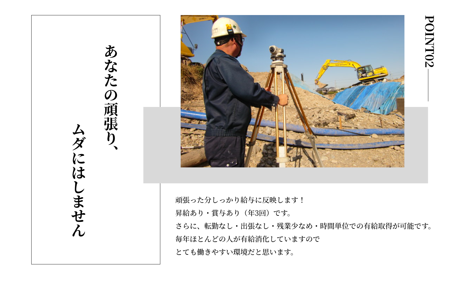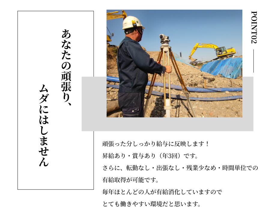 月給 24万円〜60万円 ※経験・能力を考慮します。 ※残業代は別途全額支給 ※昇給あり(年1回) ※賞与あり(年3回) ※決算賞与あり (業績による) 【試用期間】 230,000円~ ※一部手当は期間後に 支給します。 ▽収入例 1級土木施工管理取得後 ⇒月45万円~60万円 |