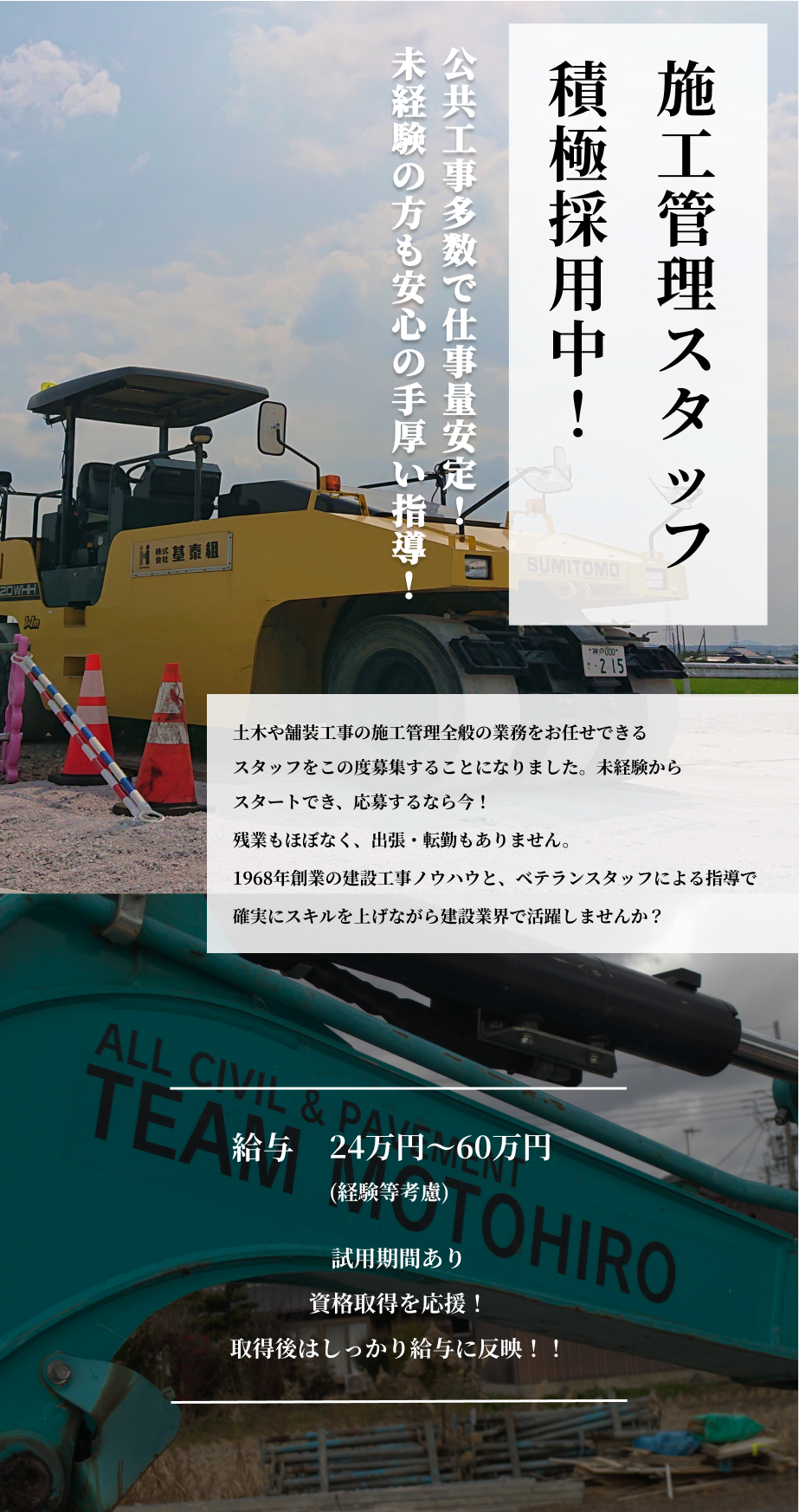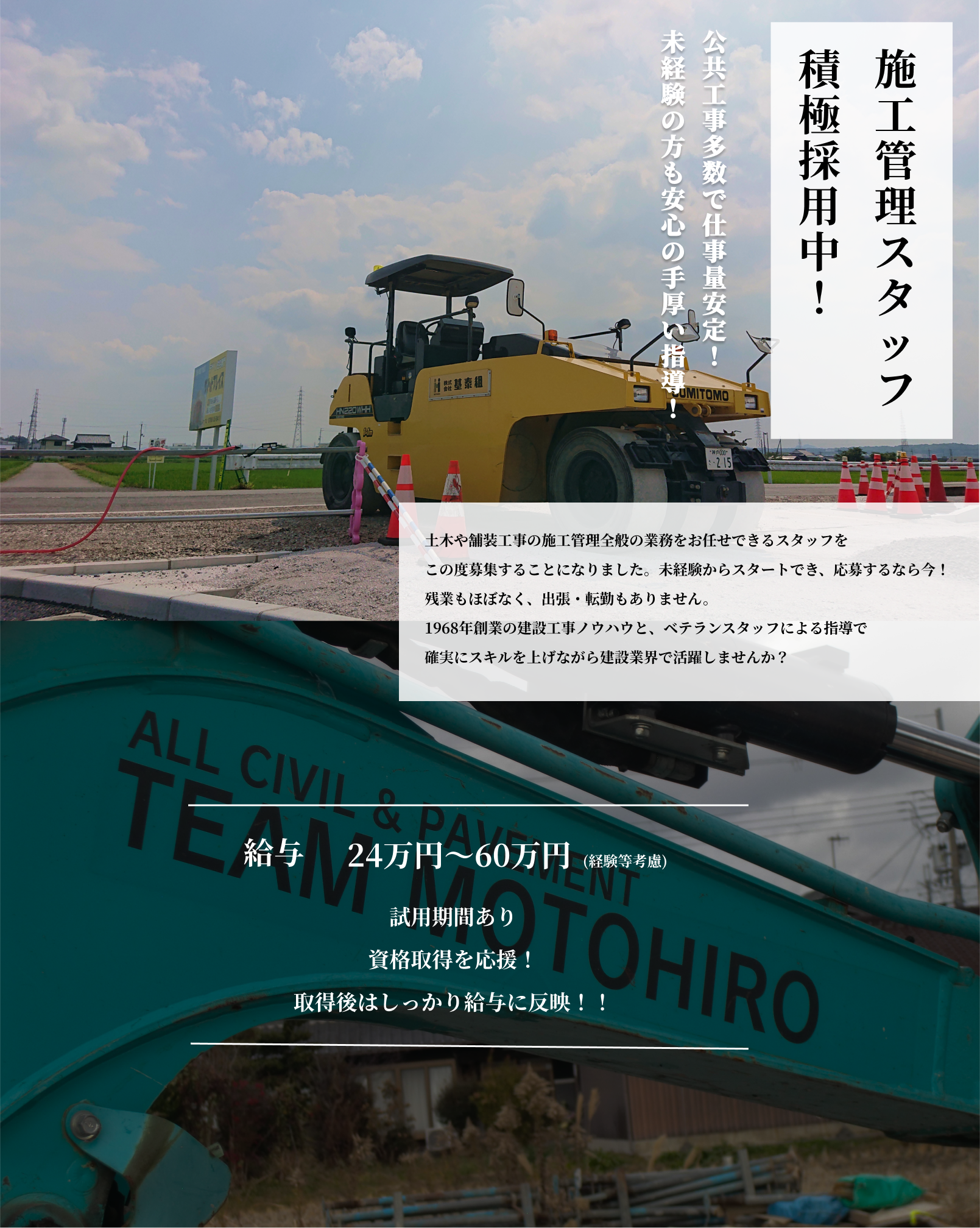 【必須】 普通自動車免許(MT) 【優遇】 1級または2級 土木施工管理技士 1級または2級 建設機械施工技士 1級または2級 舗装施工管理技術者 1級または2級 造園施工管理技士 |