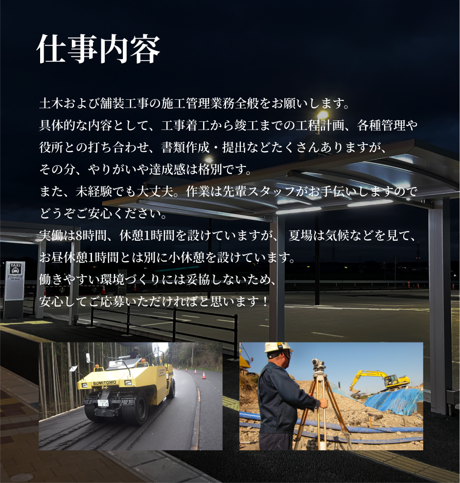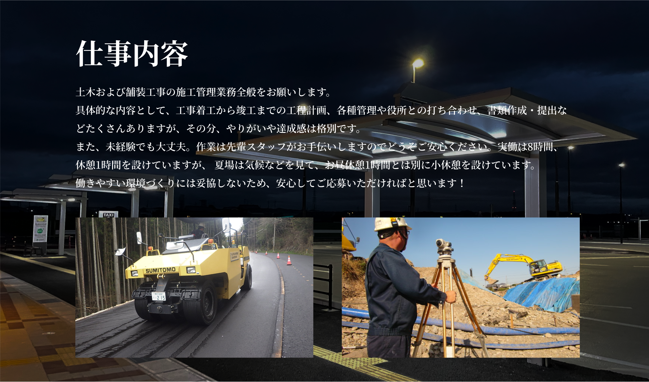 土木および舗装工事の施工管理業務全般、工事着工から竣工までを